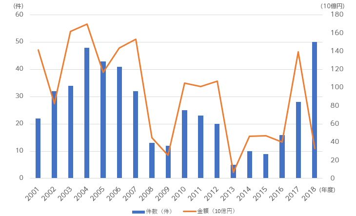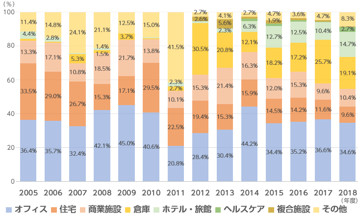 証券化によって取得された不動(dòng)産は、賃貸収入を得ることで高い収益を期待できるオフィスビルを筆頭にさまざまな施設(shè)となって社會(huì)に貢獻(xiàn)しています。2018年度は「オフィス」のシェアは前年度と同じ34.6%でしたが、「ホテル?旅館」が14.7%と過去最高を記録。「ヘルスケア」も2.7%と規(guī)模は小さいものの過去最高となり、「商業(yè)施設(shè)」も過去最低だった昨年度から持ち直しました。 2020年?yáng)|京五輪の開催が決まったのが2013年9月。翌年には証券化でのシェアが6.3%と3倍に拡大。2017年度は減少しましたが、昨年度は回復(fù)しています。五輪開催を契機(jī)とした訪日外國(guó)人が都市部だけでなく地方の観光都市にまで広がり、不動(dòng)産証券化の波が地方に押し寄せているのかもしれません。