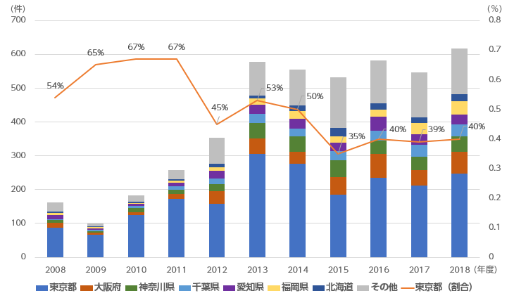リート(私募リートを含む)と不動(dòng)産特定共同事業(yè)で取得した件數(shù)は617件と、2016年の583件を抜いて過去最高を記録しました。東京五輪の開催が決まった2013年以降、前年度の354件から500件臺(tái)を続けており、東京都を中心に大阪府、神奈川県、千葉県、愛知県などの大都市圏で証券化が活発になりました。 しかし2013年度以降は東京集中のウエイトは徐々に下がり、「首都圏頼み」だった証券化も様変わりを見せています。2011年には東京都における証券化取得不動(dòng)産のシェアは67%とピークだったものが、翌年度には45%に激減。2013年度の「五輪特需」を境に下降線を辿っています。訪日外國(guó)人の東京一極集中が薄れ、地方の観光スポット人気を當(dāng)て込んだ宿泊施設(shè)ニーズがもたらしたのかもしれません。