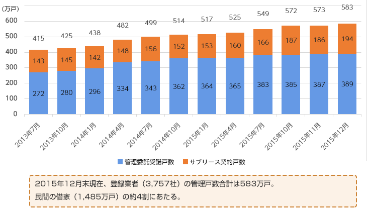 2011年12月に始まった「賃貸住宅管理業(yè)者登録制度」(登録制度)は、貸し主と借り主の間の賃借管理を委託されている受託管理業(yè)者と、貸し主とリース契約して家賃管理などを委託されているサブリース業(yè)者の2種類が対象です。少し古いですが、2015年12月末現(xiàn)在、登録業(yè)者の管理戸數(shù)は民間の借家の40%にあたる583萬戸に留まっており、登録制度が必ずしも普及しているとはいえない狀況です。