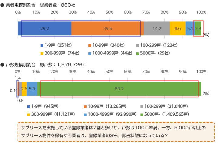 シェアハウス投資など、一部のサブリース業(yè)者が関與したトラブルが社會問題化しました。2015年12月現(xiàn)在、登録業(yè)者のサブリースの実態(tài)を見ると、5,000戸以上を管理している業(yè)者は29社で全體の3.4%。この3%の業(yè)者が國內(nèi)157萬戸あまりのサブリース物件の9割近くを占めており、寡占化が顕著です。サブリースの世界では一部の大手が市場シェアを握っている現(xiàn)狀が浮かび上がります。