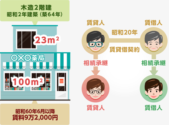 • ?現在の「賃貸人の先代」と「現在の賃借人」の先代との間で、昭和20年から賃貸開始。その後、賃貸人?賃借人の雙方で相続があり、現在の賃貸人?賃借人に契約関係が承継。