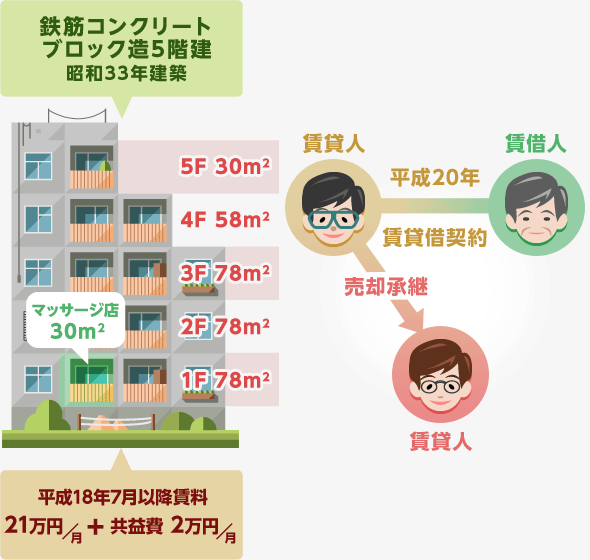 • ?前の賃貸人と現在の賃借人との間で、平成18年から賃貸開始。その後、現在の賃貸人が前の賃貸人から當該建物を購入したため、現在の賃貸人に契約関係が承継。