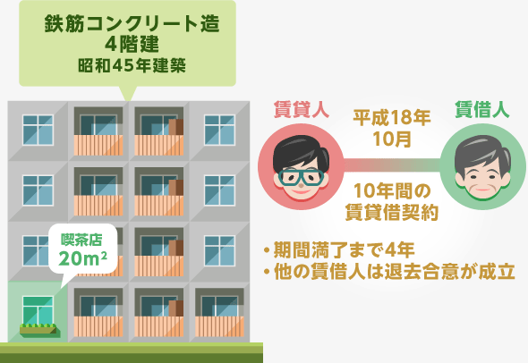 - ?賃借人との賃貸借契約書を確認すると、一番新しく契約した賃借人は賃貸期間が平成18年10月から10年となっており、その時點では期間満了までまだ4年ほど時間がある。なお、當該賃借人は當該貸室で喫茶店を営業。
