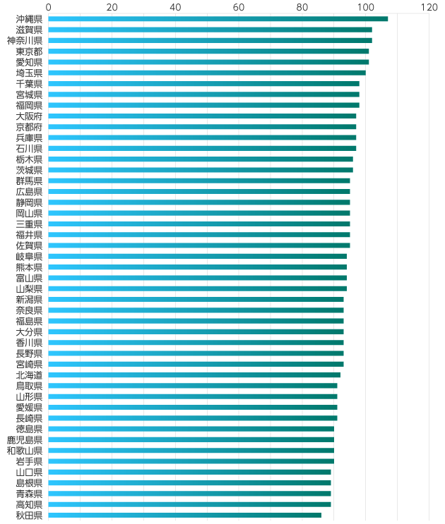 2015年と2030年の対比でみると、全國平均は106で、47都道府県中46の都道府県で100を超えます。唯一高知県のみが97となっています。高齢化による夫婦の死別時期の違い、晩婚化、離婚數の増加などが要因とされています。この數字は、地方都市でも、賃貸需要が底堅いことを示していると言えるでしょう。