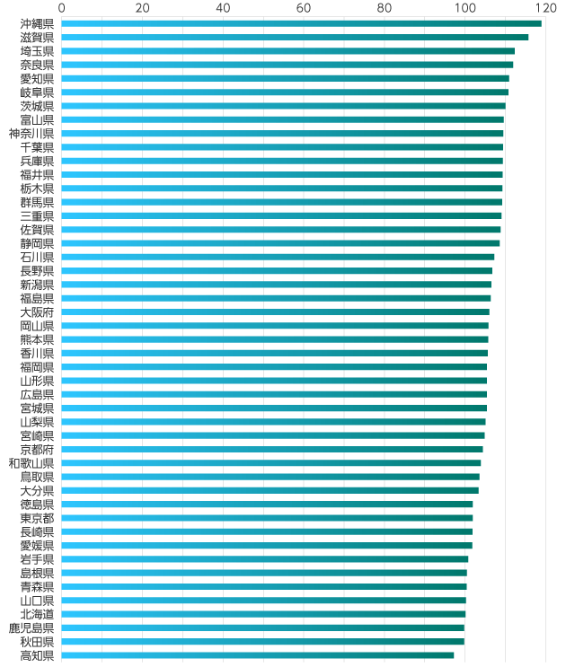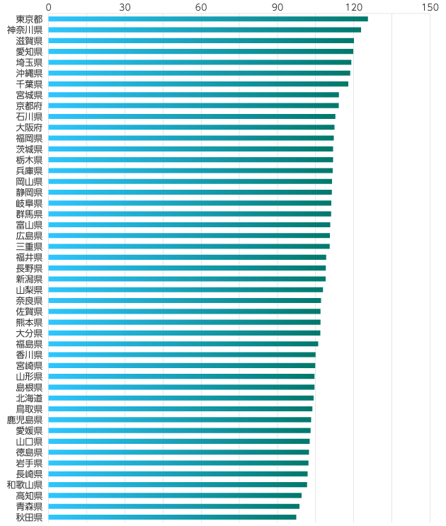 いわゆるシングルマザーや離婚數の増加の影響で、47都道府県中44の都道府県で100を超えます。全國では113、最も増えるのは東京都で対比では126、最も伸びが少ない秋田県でも97となっています。こちらも単獨世帯と同様に賃貸住宅に暮らす方々が多いとされています。