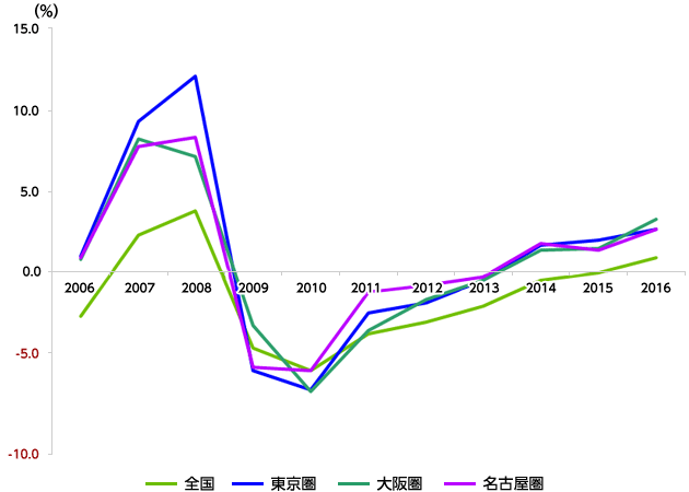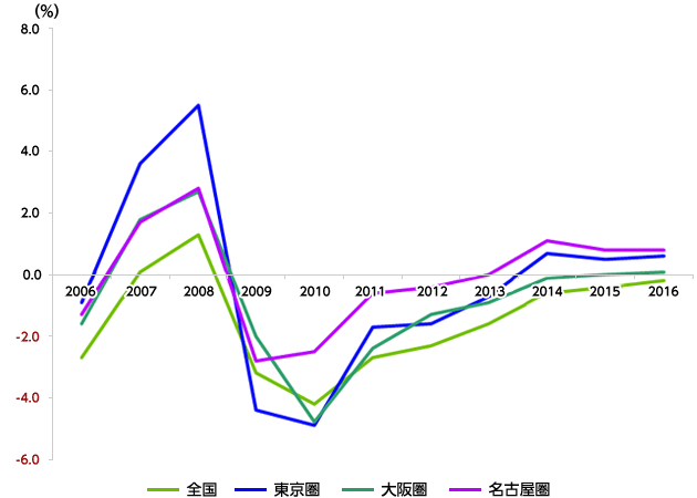 図2は、1983年から2016年までの主要大都市の地価の推移です。1980年代後半からのバブル期がいかに凄かったのかがよくわかります。それに比べて、不動産市況が盛り上がった、その後のITバブル期(2000年~2001年)、ミニバブル期(2005年~2008年)、そして昨今のアベノミクス期の地価上昇の小ささもわかります。