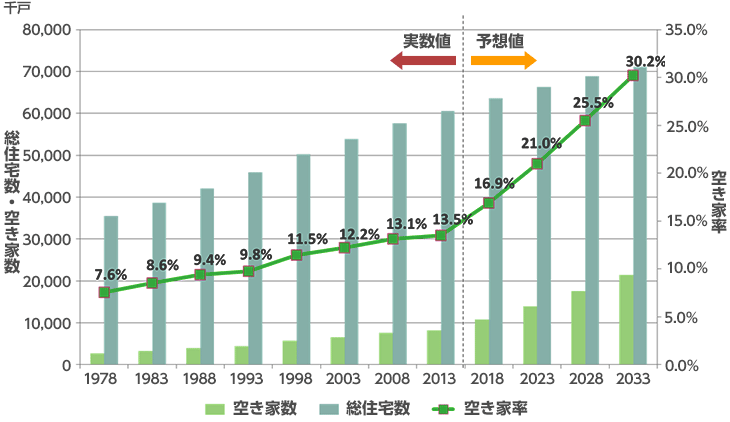 (実數値:総務省「平成25年 住宅?土地統計調査」予測値:野村総合研究所公表データより作成)
