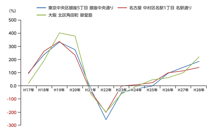 上図は、3大都市の各都市の最高地點における路線価(1m²當たり)の増減率推移を示したものです。大都市の主要地點では4~5年連続してプラスになっていることがわかります。