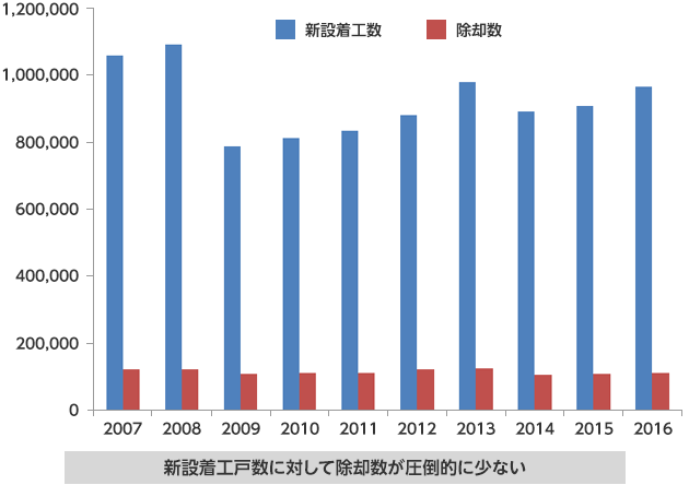 図1は、2007年~2016年の新設住宅戸數と除卻數の推移です。