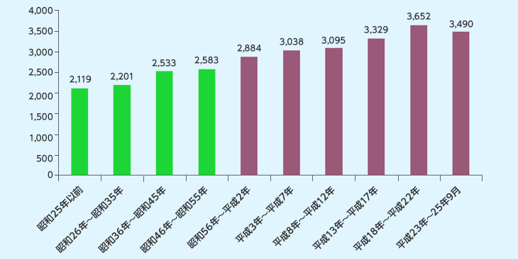 図2は、民間賃貸住宅における建築時期における家賃をしましたものです。全國平均ですので、各地で異なりますので、実數字はあまり気にせず傾向だけを見ていただきたいと思います。