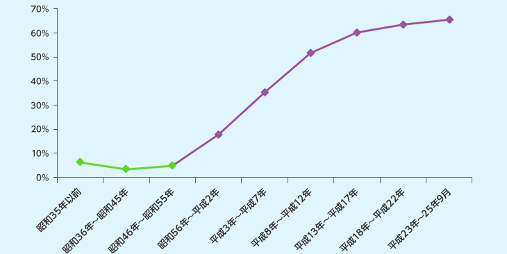 また、水回り設備については、取り換えなど適切にリフォームが行われていればいいですが、そうでない物件も多いようです。建築年別 オートロック有の賃貸住宅割合