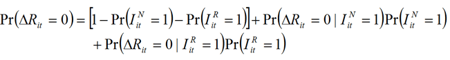 はi住戸のt期において、居住している契約者が賃貸住宅オーナーとの間で継続契約が行った時には1を、それ以外は0を示しています。また、Ritはi住戸のt期の家賃水準を示しており、△Rit=Rit-Rit-1は契約時における家賃変化分を示します。そうすると、家賃が変化しない確率(Pr(△Rit=0))を、次のように表現することができます。