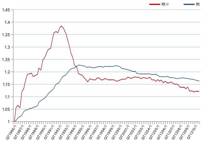 これは、バブル期を含む1986年から2010年までの長期の新規家賃と支払家賃の推移を見たものです。赤色の線が新規家賃ですが、バブル期に大きく上昇し、その後に大きく下落し下がり続けてきたことがわかります。しかし、賃貸住宅経営の中で重要な指標となるテナントの支払家賃を示す青色の線は、バブル期にゆっくりとしか上昇しませんでしたが、株などのように暴落することはなく、ゆっくりと推移してきていることがわかります。