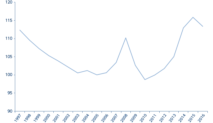 2011年から2015年までの5年間、集合住宅の建築費は上昇を続けます。2011年の指數が98で2015年の指數が115ですので+17ポイント上昇しています(実際の建築価格ではなく、あくまで指數です。)