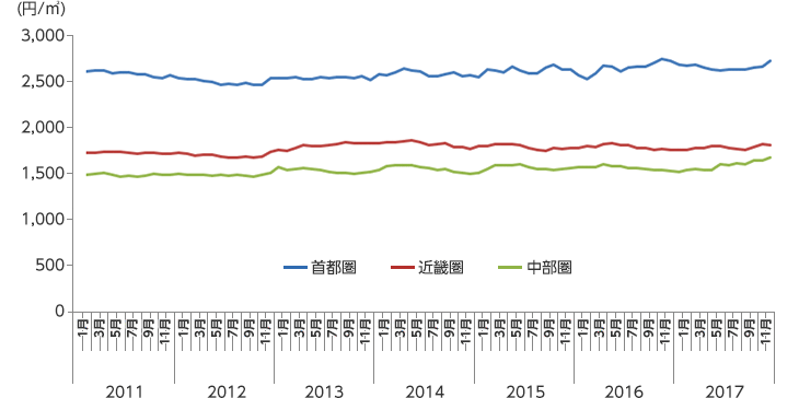 を見ると、2017年の半ば頃から、首都圏、中部圏、いずれも上昇基調(diào)にあります。関西圏も、やや遅れて上昇ムードになっていることが分かります。