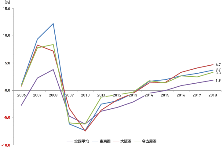 その傾向は、大都市圏でより鮮明で、東京圏、大阪圏においては、50%を超える上昇の年もありました。