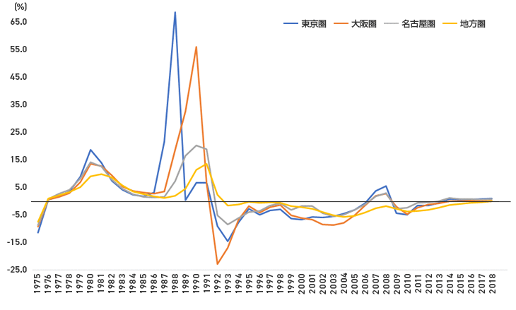 1980年代後半から90年にかけていわゆるバブル期の大きな伸びが印象的です。この間は、好景気が長く続き、不動産投資ブームが起こりました。またベビーブーム世代が自宅を購入する時期と重なり住宅建築ラッシュになり、地価が急上昇しました。
