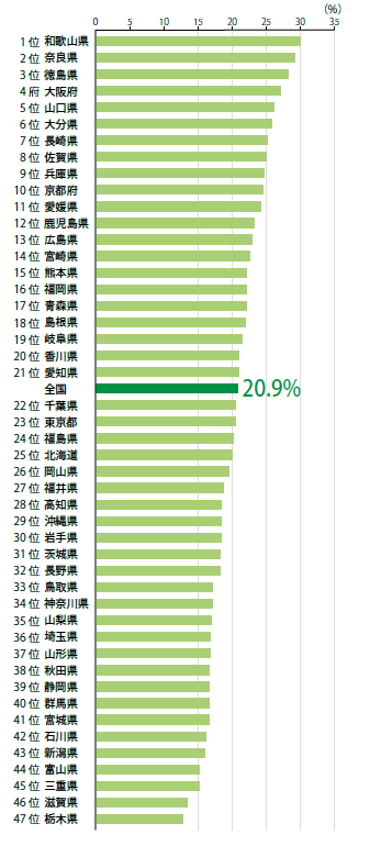 舊耐震賃貸住宅の占める割合の全國平均は20.9%、つまり5棟に1棟は、舊耐震基準下の物件となっています。最も多い和歌山県では、舊耐震賃貸住宅の割合は30%に達します。ちなみに、最も少ない栃木県では、13%とかなり低い數字です。