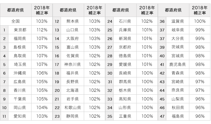 2013年時點の予測では、2015年から2040年で92.2%(人口はマイナス7.8%)でしたが、2018年の予測では、101.8%(人口はプラス1.8%)とマイナスからプラスに転じました。同様に、福岡県では、86.8%が92.2%となり、プラス5.4ポイントとなっています。図2を見れば分かるように、29都道府県が2013年の予測よりもプラスになっています。都市部を中心に、人口減少のスピードが緩やかになっているようです。