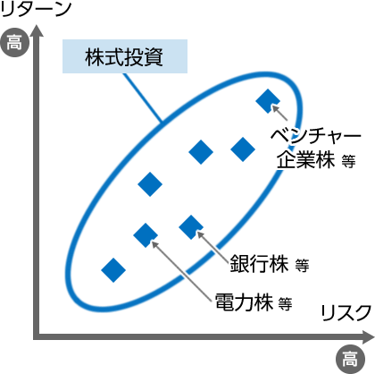 どれくらいのリスクを取ってどれくらいのリターンを狙うかは、投資する各人の趣向によります。これは、図2下の株式でも同じことがいえます。ベンチャー企業の株式などは大きく跳ねることもありますが、吸収合併(あるいは倒産)することもあります。