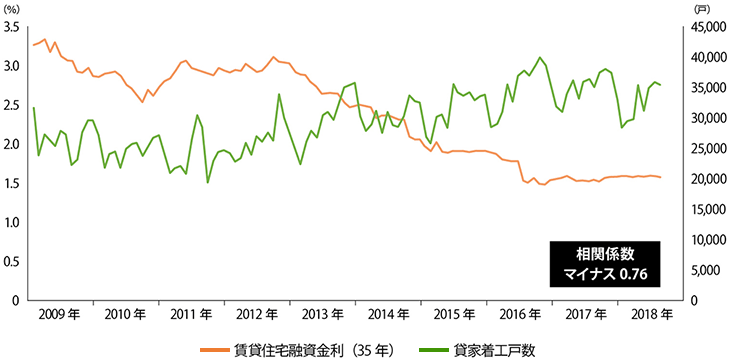 一方で、日銀は低金利誘導政策を続けており、賃貸住宅融資の金利は過去最低水準が続いています。いうまでもありませんが、金利の低さは、賃貸住宅著工を押し上げる要因となります。