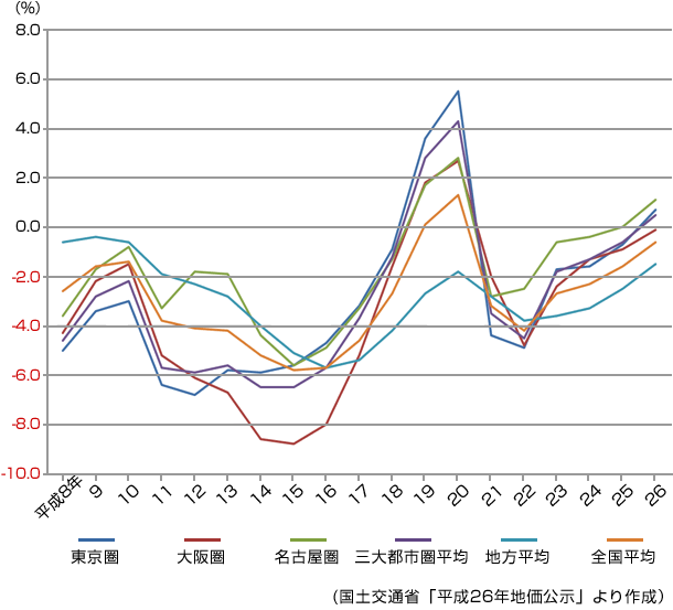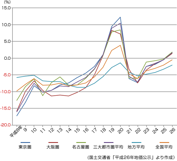 こちらの回復は住宅地よりも明らかで、平成26年には3大都市圏すべてでプラスの値を示し、全國的にみても、わずかな下落(マイナス0.5%)となっている。(グラフ2)