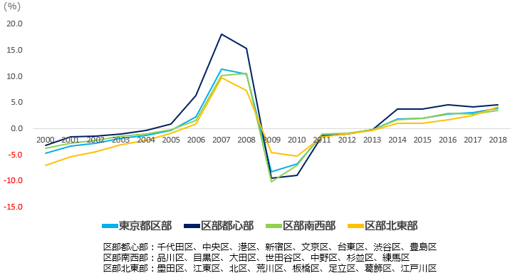 図2は、2000年以降の東京都における住宅地の地価公示増減率を示したものです。東京では、2013年以降、プラスになっていることがわかります。2019年も都市部では、大きな上昇率ではないものの、上昇すると思われます。ここでのポイントは、ミニバブル期と呼ばれた2005年~ 2008年に東京都ではおおよそ4年弱の地価上昇でしたが、現(xiàn)在の好景気(地価上昇)は5年、2019年もプラスとなると6年連続となることです。上昇幅は小さいものの、その長さはバブル期に匹敵するもので、仮に2020年の地価公示もプラスとなれば、バブル期を超える長さとなります。