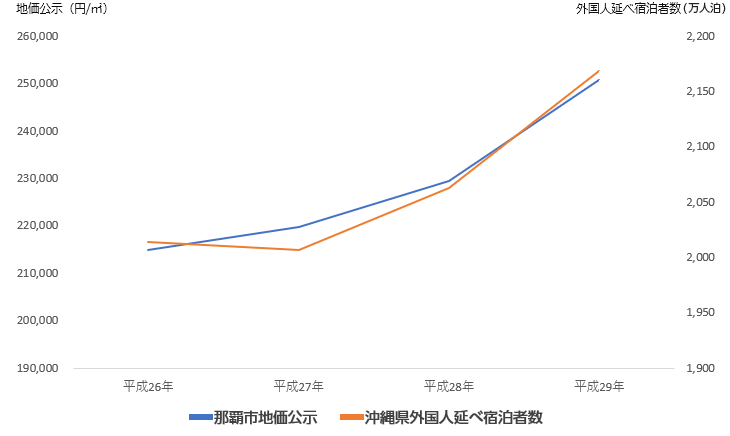 図3:沖縄県外國人延べ宿泊者數(shù) と那覇市地価公示(商業(yè)地)の推移