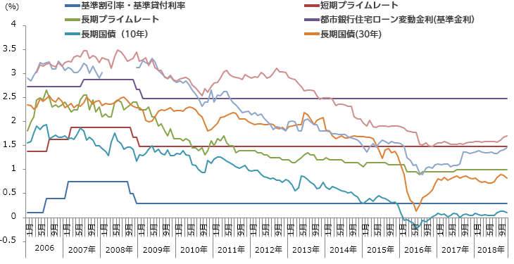 不動産市況を占ううえで、重要な要素となるのが金利の動向です。2016年年初から超低金利が続いていましたが、2018年の半ば頃から上昇ムードになっていました。しかし、2018年11月以降は再び金利は低下ムードです。