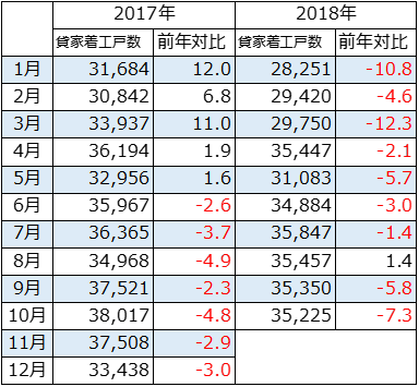 2017年1年間の貸家著工戸數(shù)は約41萬9000戸。2018年の10月末までは約33萬戸、昨年の同期間が約34萬8000戸ですから、10カ月?lián)Q算では-5.1%です。この數(shù)字を単純に掛けると、2018年の年間貸家著工戸數(shù)は約39萬8000戸となります。