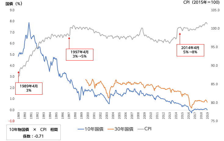 図は、1989年から2019年年初までの國債金利(10年物、30年物)の推移とCPI(消費者物価指數)の推移を示したものです。