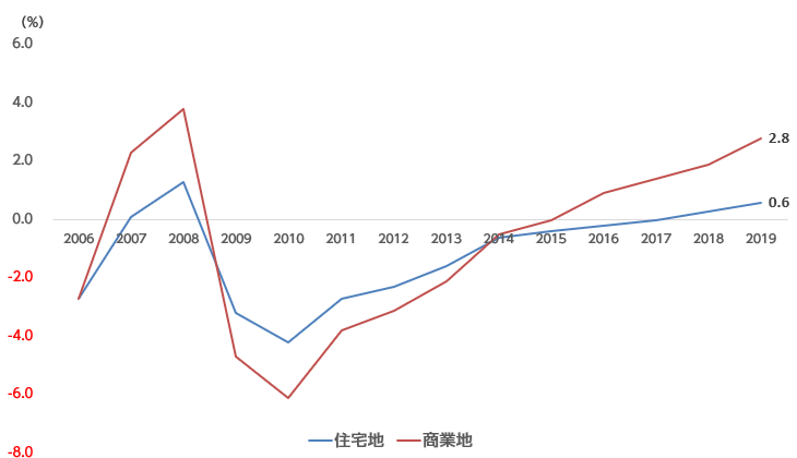 図1は、2006年~2019年の全國の公示地価変動率の推移です。住宅地が青線、商業地が赤線です。