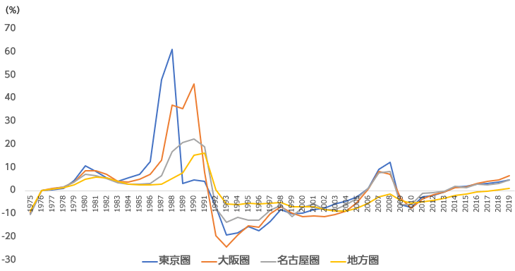 また、図2?図3を比べると、エリア間の時差がよくわかります。バブル期には、東京圏から少し遅れて大阪圏、そこからまた少し遅れて名古屋圏が価格上昇となっています。そして、地方圏(主には、福岡?仙臺?広島?札幌といった地方中心地の政令指定都市が該當します)と名古屋圏との間に時差はあまりないことがわかります。しかし、2000年半ばのミニバブル期、そして2013年から現在までの好景気では、地価上昇において東京圏?大阪圏?名古屋圏の間にそれほどの時差はありませんでした。一方、地方圏はバブル期と同じく多少遅れています。