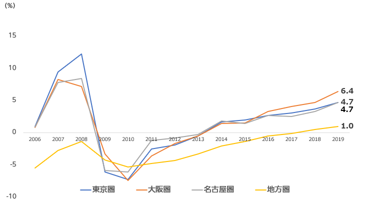 東京圏、大阪圏、名古屋圏の三大都市圏では2014年以降6年連続のプラスとなり、商業地?住宅地とも、上昇幅が拡大しています。 2019年の地価公示で特徴的なのは、地方圏(全國から三大都市圏を除いたエリア)の住宅地が27年ぶりに+0.2%になったことです(前年は-0.1%)。不動産価格上昇の波が、確実に地方都市に波及していることがわかります。