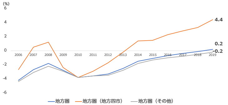 地方4市の住宅地地価は、2013年から伸び始め2019年に至るまで7年連続で上昇しています。三大都市圏の住宅地は上昇幅が伸び悩んでいますが、地方4市は上昇幅も拡大しています。