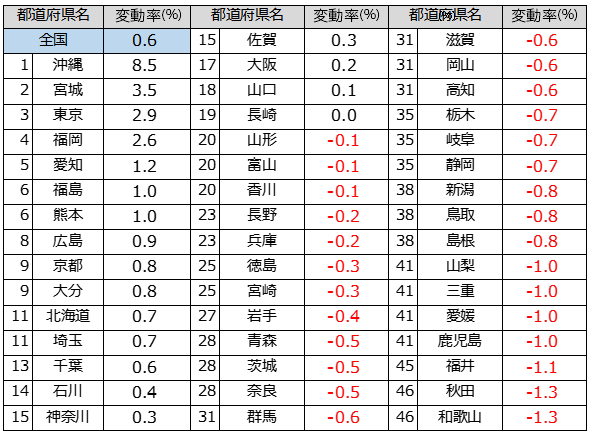 まず、特筆すべきは19の都道府県でプラスになったことです。不動産価格上昇の波は三大都市圏や地方中核都市だけでなく、大分県(+0.8%)、石川県(+0.4%)、佐賀県(+0.3%)、山口県(+0.1%)といった地方都市へも広がっていることがわかります。沖縄県は2年連続の伸び率トップで2位に圧倒的な差をつける+8.5%となっています。