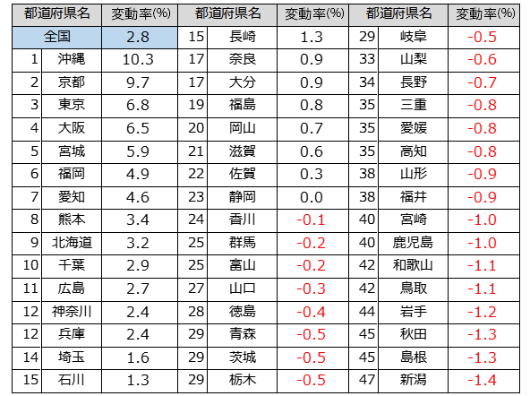 商業地においても圧倒的な伸び率を示しているのが沖縄県です(+10.3%)。これに肉薄しているのが京都府(+9.7%)、昨年と同じく沖縄?京都という日本を代表する観光地が2トップとなりました。