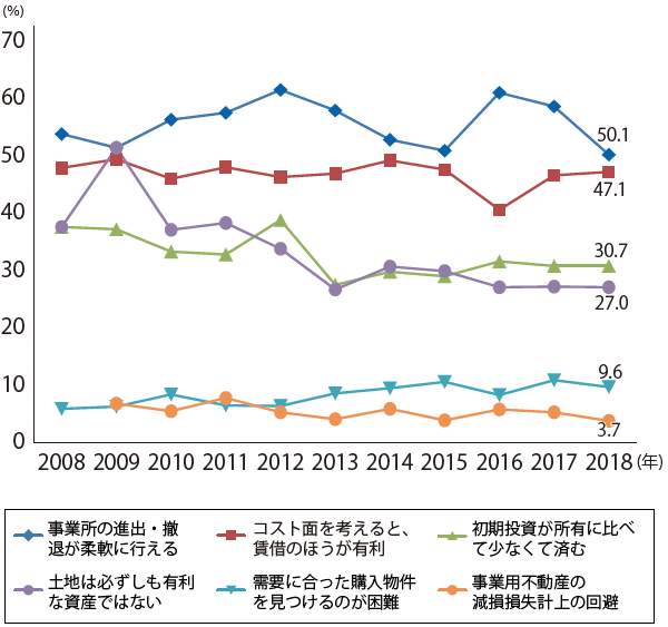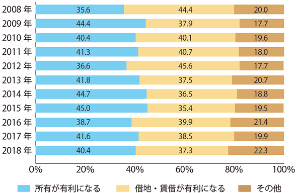 「所有したほうが有利」と答える企業(yè)は近年概ね4割程度になっています。(最新の2018年度では40.4%で対前年度比-1.2%)。逆に「借地?賃借が有利」の回答も、4割前後で推移しています(2018年度は37.3%)。概ね拮抗する數(shù)字が続いていますが、ここ10年を見ると、「所有が有利」との回答が多かったのが8回、「賃借が有利」のほうが多かった年が2回となっています。