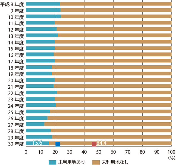 自社所有地を持つ企業(yè)のうち、未利用地のある企業(yè)の割合は、15.6%となっています。この20年間を俯瞰すると概ね15 ~ 20%の間の數(shù)字となっています。