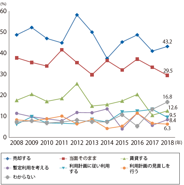 未利用地の今後の対応策としては、「売卻する」が43.2%と最も多くなっています。次いで、「當(dāng)面そのまま」が29.5%、「賃貸する」が12.6%、「利用計畫に従い利用する」が9.5%となっています。