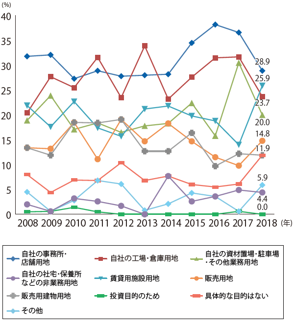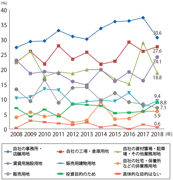 1位は、「賃貸用施設(shè)用地」が30.2%と最も多く、次いで「自社の事務(wù)所?店舗用地」が17.7%となっています。賃貸用施設(shè)はここ2 ~ 3年増えています。前項理由のうち、企業(yè)が「事業(yè)の資金調(diào)達や決算対策」に活用しているものと思われます。
