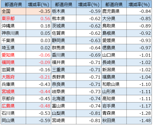 都道府県別に見ると、人口が増えているのは東京、埼玉、千葉、神奈川の一都三県と沖縄県の5つにとどまり、あとの42道府県は減少となっています。最も増えたのは東京都で+7萬3,000人(+0.56%)、続いて神奈川県の4,100人(+0.05%)となっています。逆に、北海道は4萬人近く減少しており実數(shù)ではトップです。割合では秋田県が-1.48%でトップになっています。(人數(shù)は概數(shù))