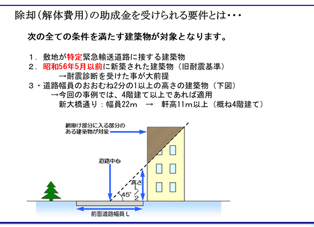 除卻(解體費用)の助成金を受けるためには、三つの要件のすべてを満たす必要があります。一つ目は、敷地が特定緊急輸送道路に接する建築物でなくてはならないこと。緊急道路には2種類あり、特定とついているものと普通の緊急輸送道路の2種類に分かれます。解體の助成金が出るのは特定がついている道路で、ついていない道路は対象外です。二つ目は、昭和56年5月以前に建築された建物で、さらに區が行っている耐震診斷を受けた物件が対象になります。三つ目は、既存の建物が道路幅員のおおむね2分の1以上の高さでないと助成金は受けられません。