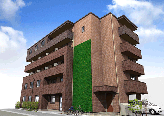こちらが完成予想図ですが、緑色の部分は壁面緑化です。敷地の面積が大きいため、區の條例で緑化の條例に適応する必要がありました。しかし、敷地目一杯に建物を建てましたので、緑地に使う分が少し足りなくなり、壁も使いながら緑化を図りました。実際に、1?2階の保育園の運営事業者様が他の保育園に見學に行かれた中に壁面緑化を使った建物があり、同じようなかたちで緑を入れたいというお話をオーナー様からいただいていました。最近では、壁面緑化もよく見られるようになりました。