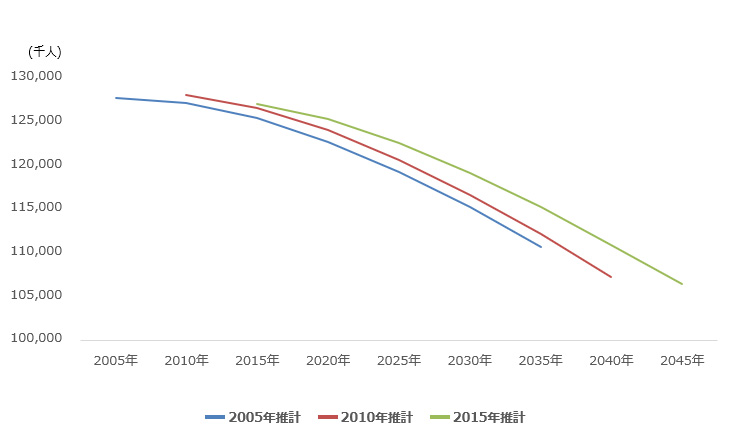 図1は、國立社會保障?人口問題研究所が予測している日本の將來人口推計です。青線が2005年に予測された(発表された)もの、赤線が2010年に予測されたもの、緑線は2015年に予測されたものです。