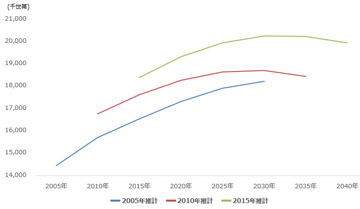日本の將來世帯數の予測も、減少するポイント(つまりピーク時)がだんだん遅くなっています。2005年の予測ではピークが2015年頃でしたが、2015年の予測では2025年頃になっています。2005年時の予測と2015年時の予測では、 2030年の數値に500萬世帯の差が生じています。かなり大きな差があります。