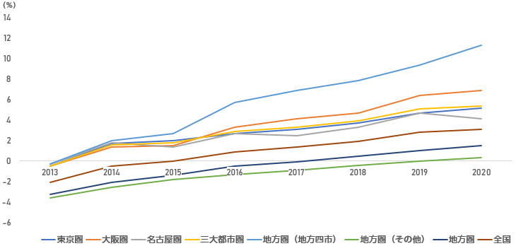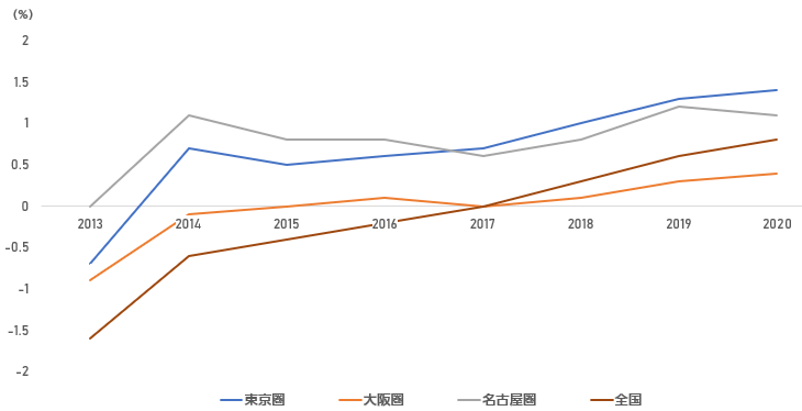 ?三大都市圏(東京?大阪?名古屋)の上昇は全用途2.1%(前年2.0%)と、上昇幅に歯止めがかかる