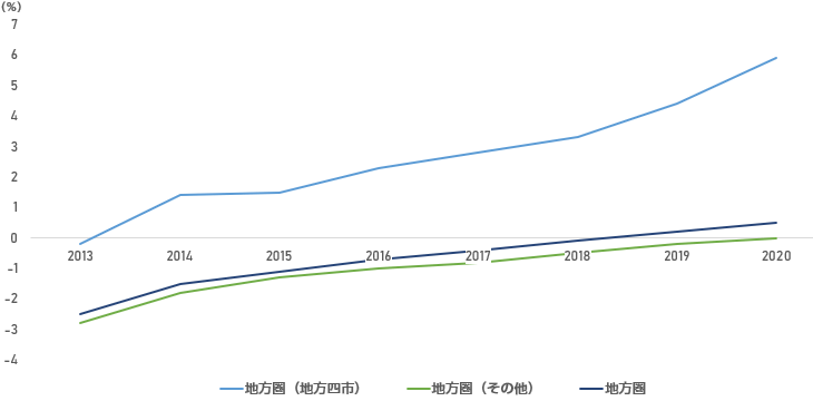 これを見(jiàn)ると、地方圏、とくに地方中核4市の上昇が際立って目立つことが分かります。