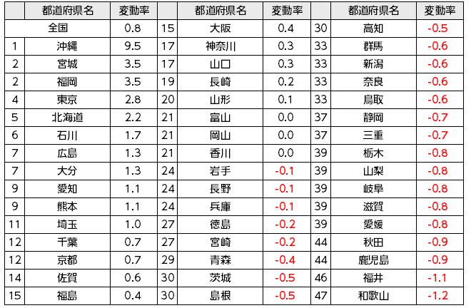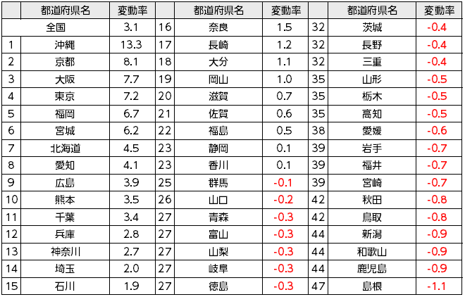 続いて商業(yè)地です。全國(guó)平均は+3.1%。最も上昇したのは沖縄県で13.3%でした。前年が10.6%でしたので、伸び幅も上昇しました。2位は京都府で+8.1%。前述のように、京都は前年の伸び幅8.7%から減少し、少し陰りが見(jiàn)え始めました。