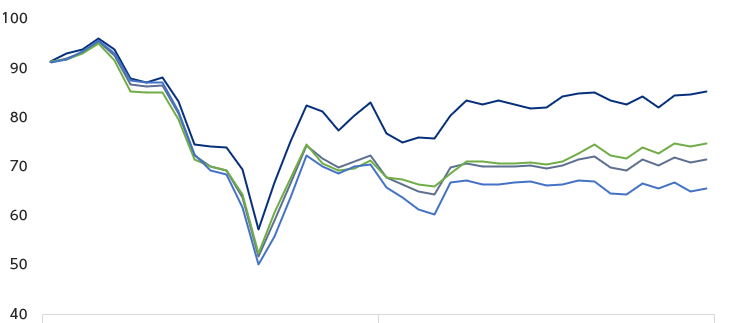 JREIT価格は、2月下旬頃まではかなりの高水準でしたが、3月中旬から一気に減少したことが分かります。下のグラフは2月の平均指數を100とした時に3月~4月の指數推移となります(図1、2ともグラフの色は同じ)。